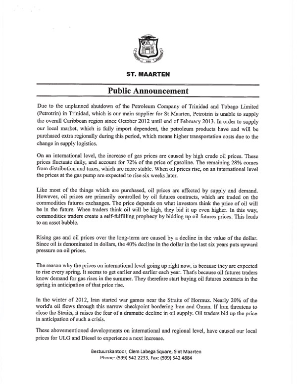 This rating was also made possible by the sovereign rating of Baa1, which St. Maarten received from Moody's. Although the previous administration set the ball rolling, the current government recognized the importance of this and worked diligently and tirelessly to achieve the sovereign rating. Naturally, this would not have been possible without St. Maarten obtaining its new constitutional status on October 10, 2010.